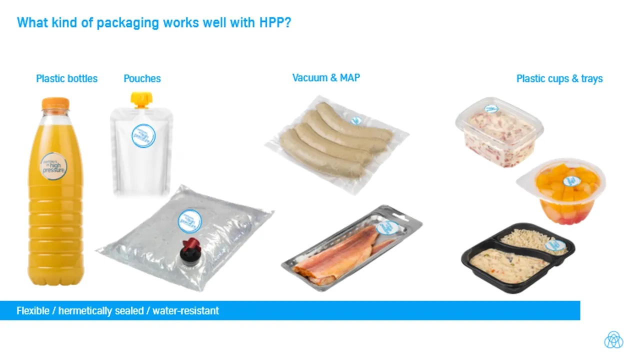 During pressure treatment, the food and packaging material may undergo a 15% volume reduction and then return to its original volume upon depressurization. This requires that the packaging be flexible enough to withstand a transient volume reduction while under pressure. HPP products are typically vacuum-packaged using flexible pouches or containers. Polyethylene terephthalate (PET), Polyethylene (PE), Polypropylene (PP), and Ethylene vinyl alcohol copolymer (EVOH) are the commonly used packaging materials. At least one interface of the package need to be flexible enough to transfer pressure. Rigid packaging containers such as glass bottles or tin cans cannot be used for HPP due to the inability to transmit pressure to the food product. The packaging material must also be able to survive intensive pressure treatment and needs to have high-barrier properties towards moisture and oxygen transmission.